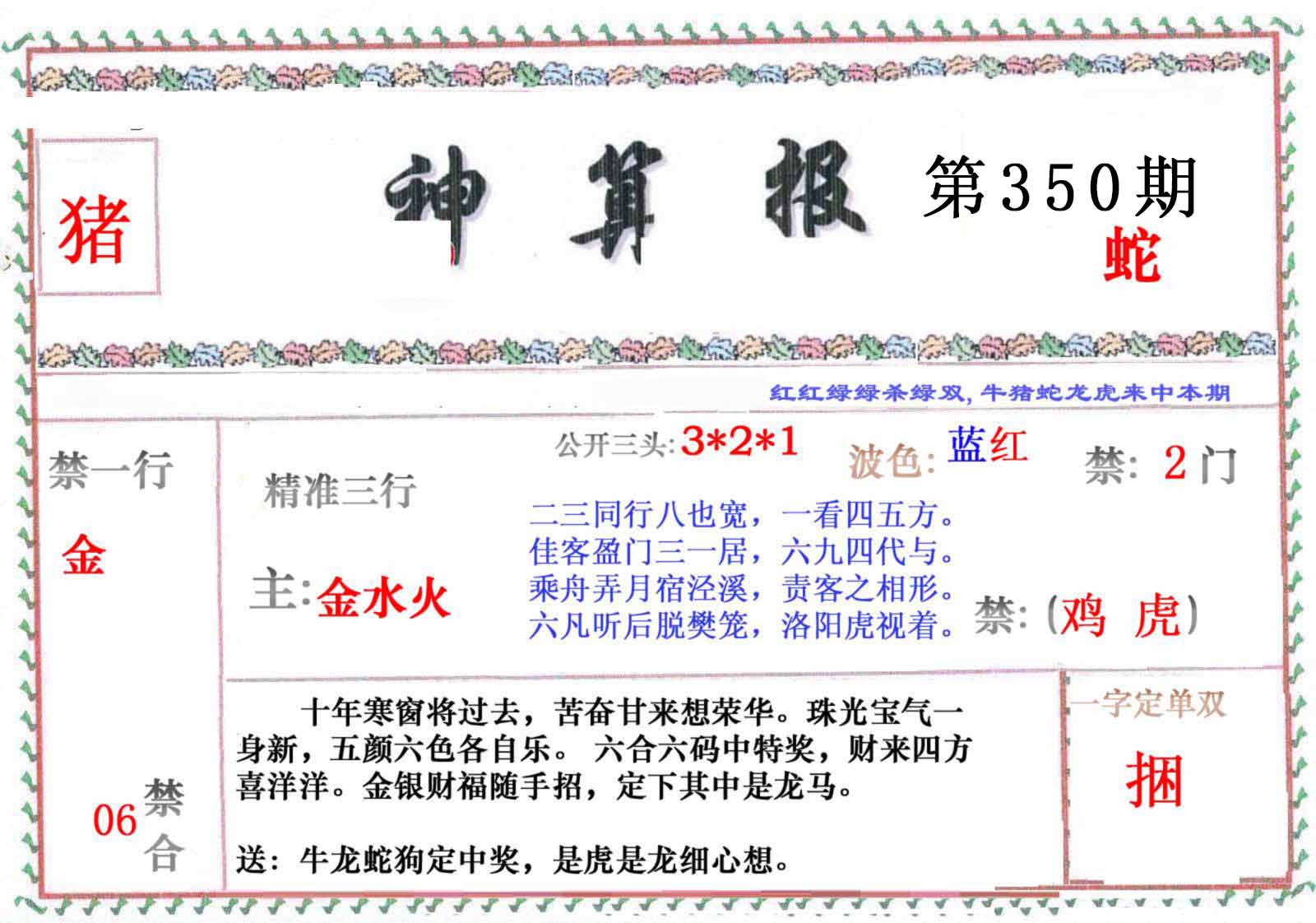 | 346期 | 猪 | 蓝单 | 1 | 8 | 开:蛇25 |
